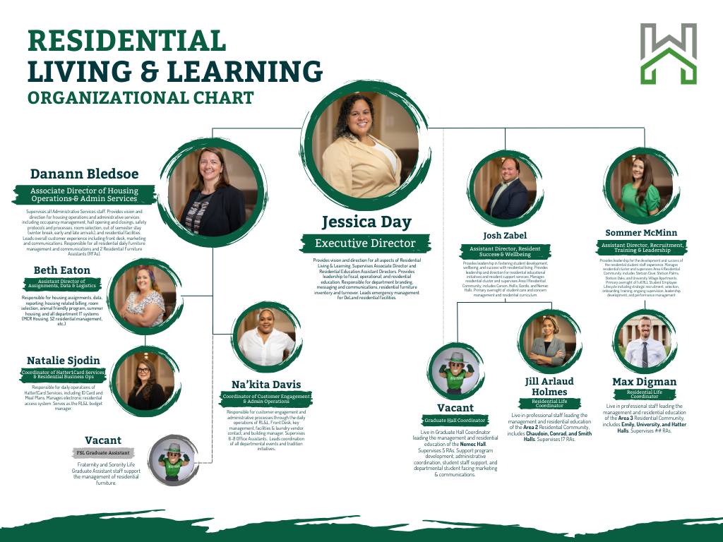 Welcome to the Residential Living & Learning team! We are a dedicated group of professionals committed to providing a vibrant and supportive living environment for all of our residents. Each member of our team plays a vital role in fostering a sense of community, supporting student success, and ensuring a safe and welcoming campus experience.