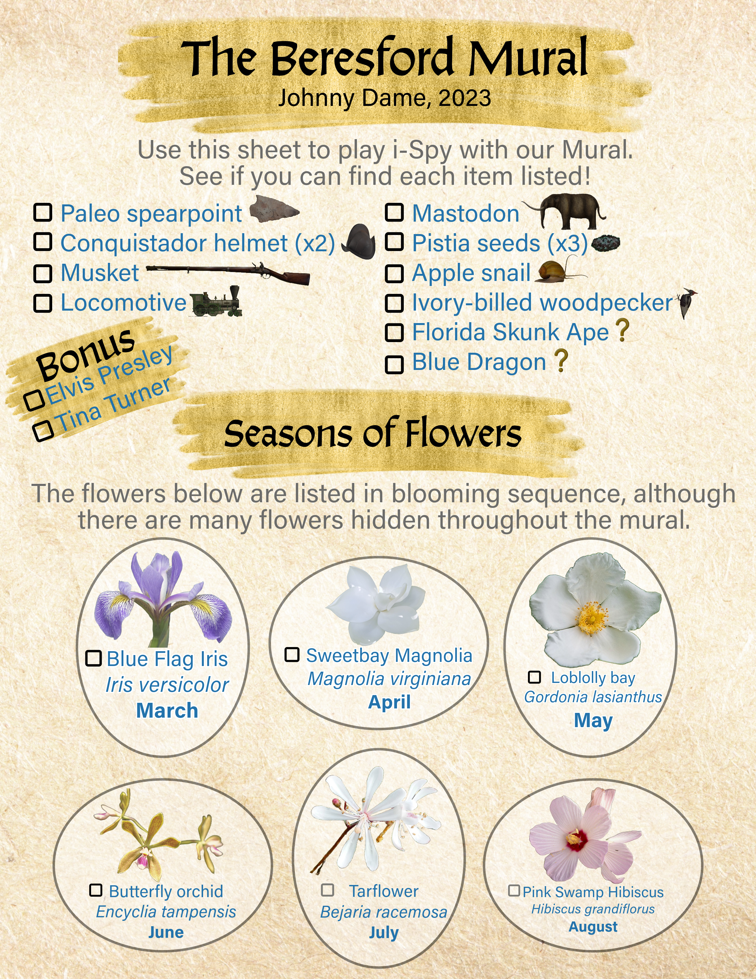 Johnny hid many items in The Lake Beresford Historic Mural. Some of them are compiled into an i-Spy worksheet that can be printed or downloaded to explore the Mural with. Physical copies of the Beresford Mural i-Spy are also available at the Aquatic Center upon request.
